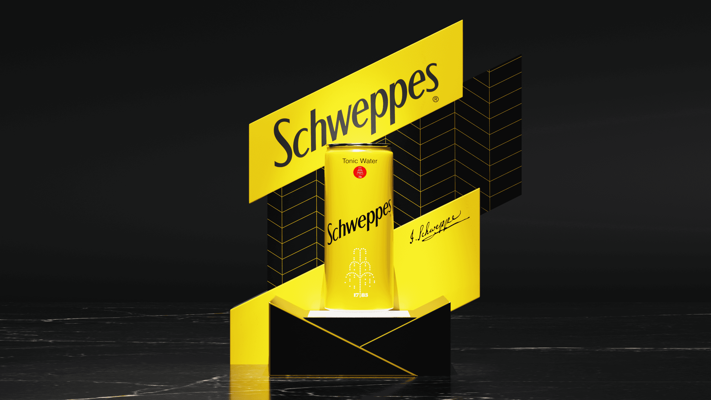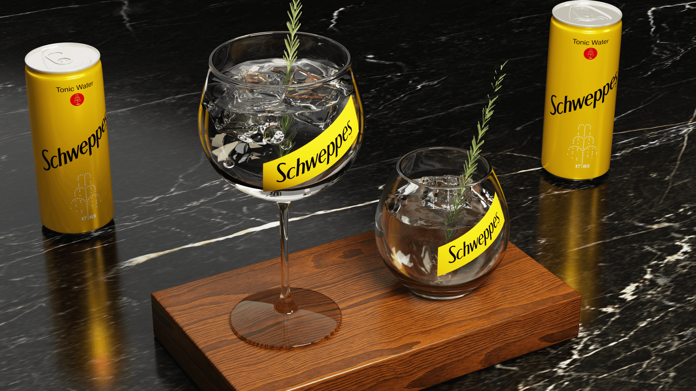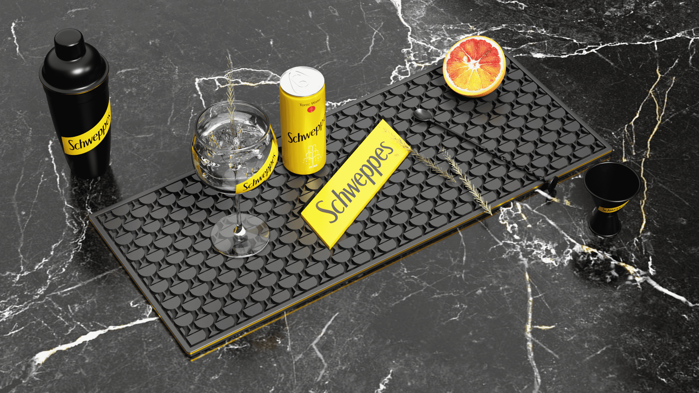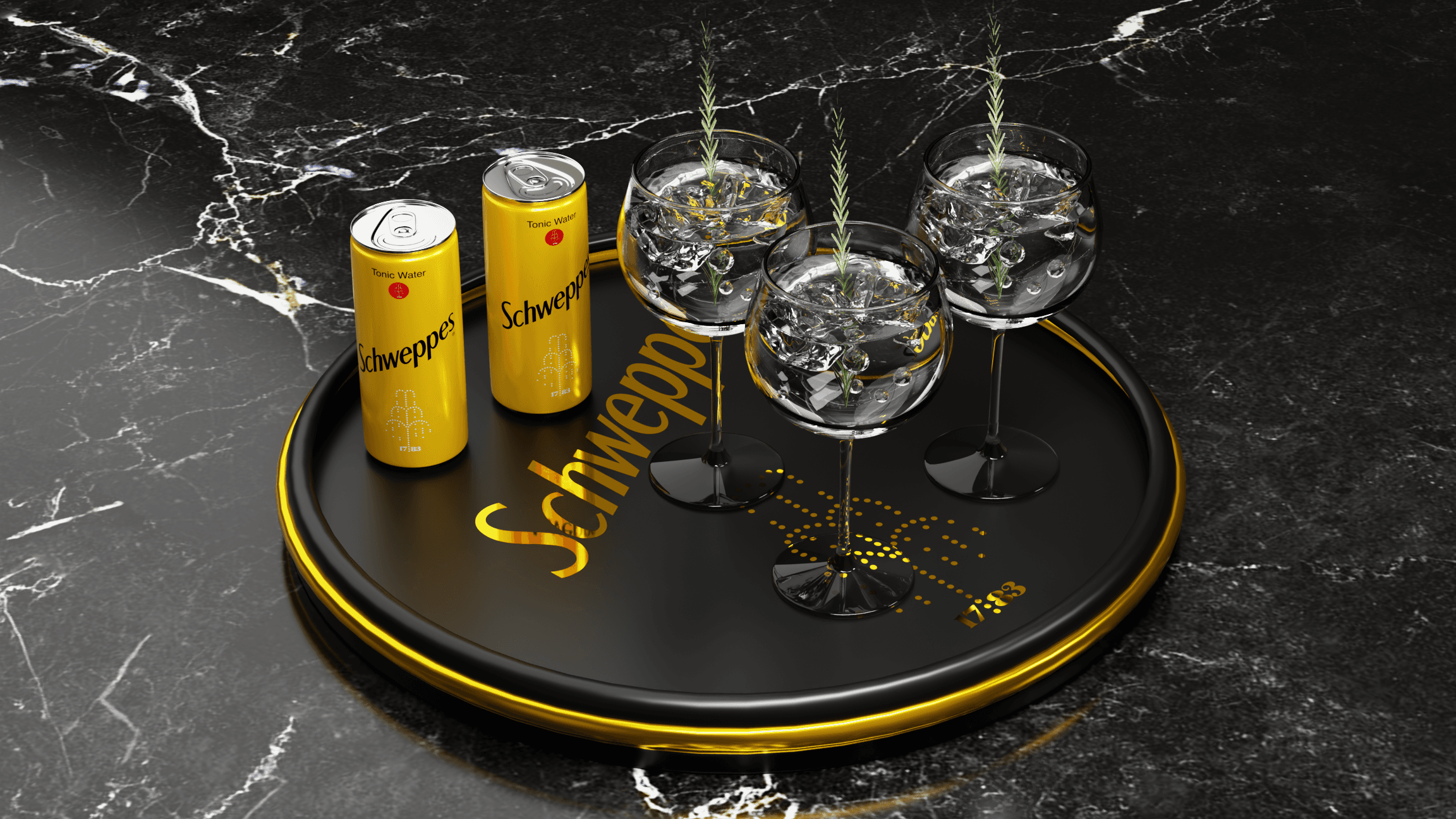 A series of Schweppes-branded bar elements designed for an event, including mixology tools, glasses, and product glorifiers. Full 3D development and conceptualization with a focus on materials, textures, and premium brand presence.