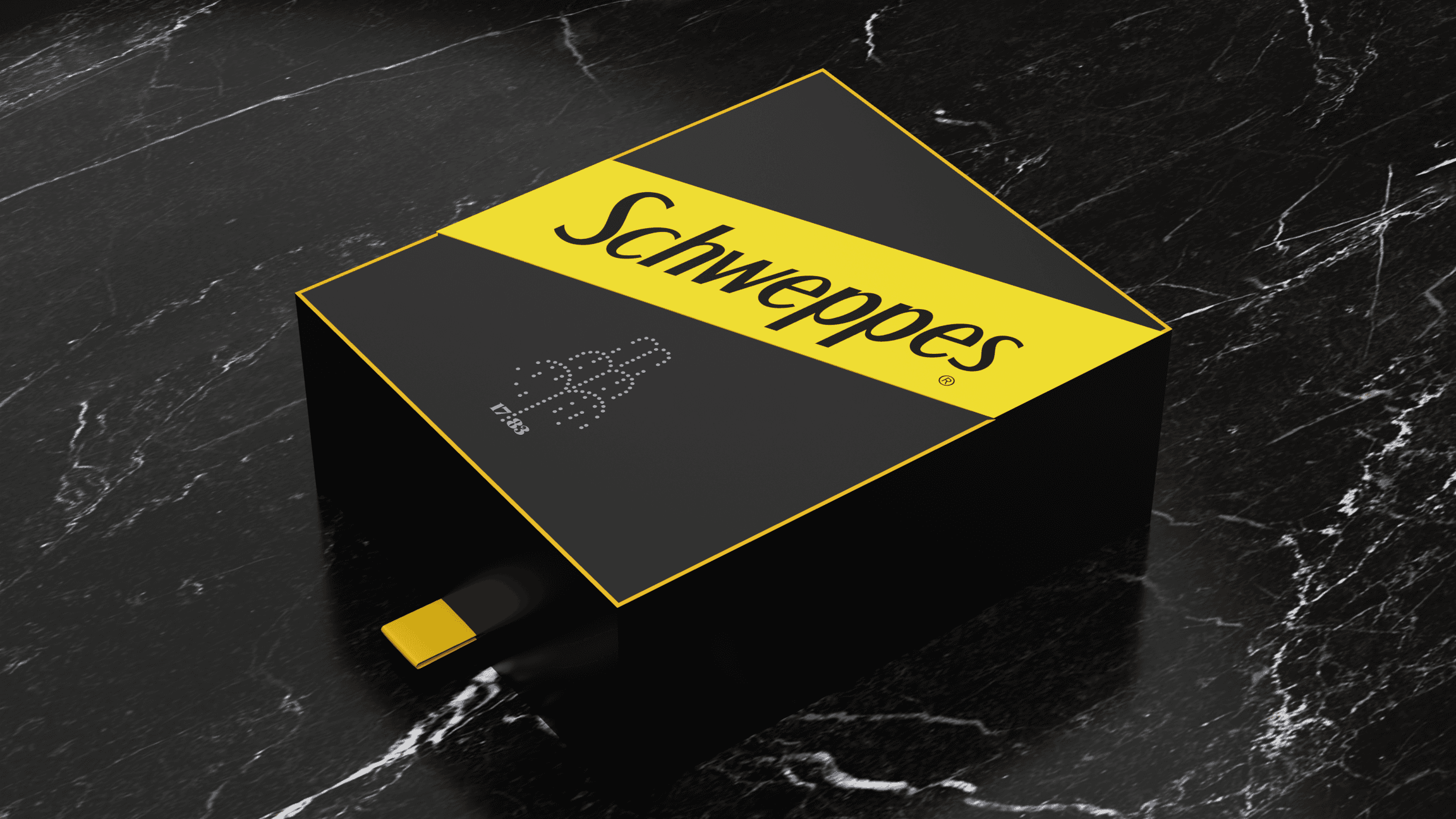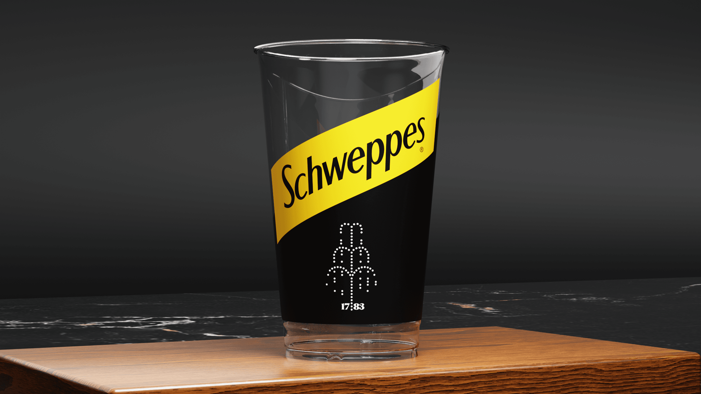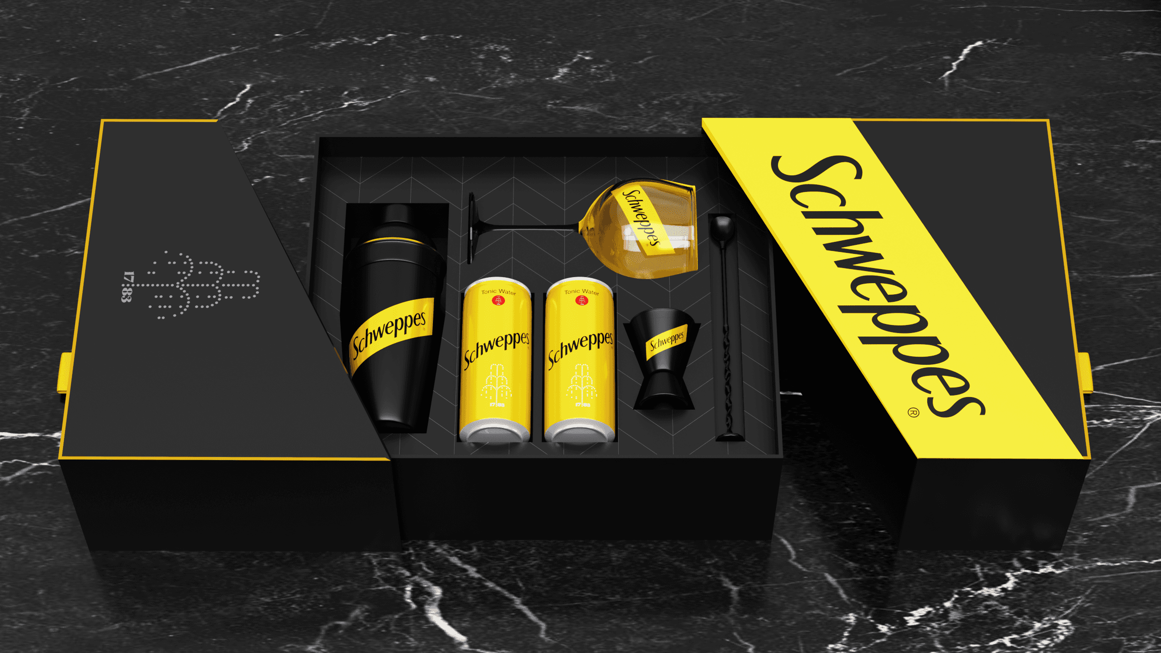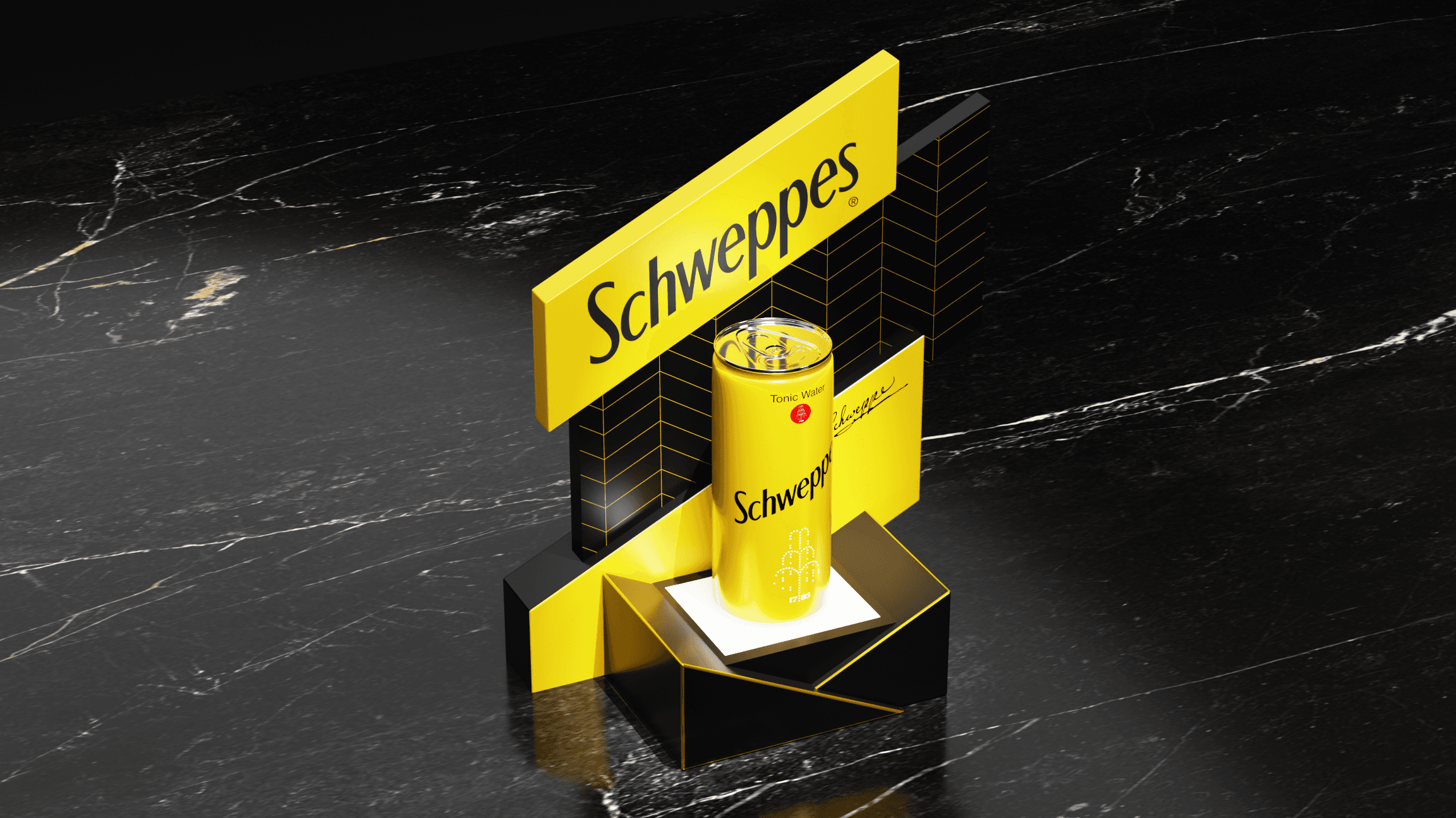 A series of Schweppes-branded bar elements designed for an event, including mixology tools, glasses, and product glorifiers. Full 3D development and conceptualization with a focus on materials, textures, and premium brand presence.